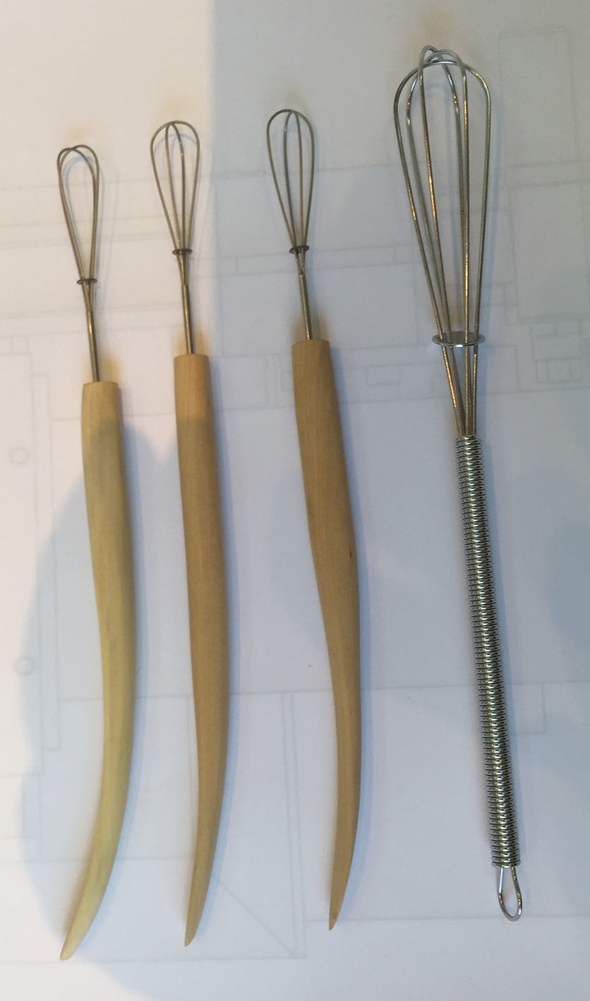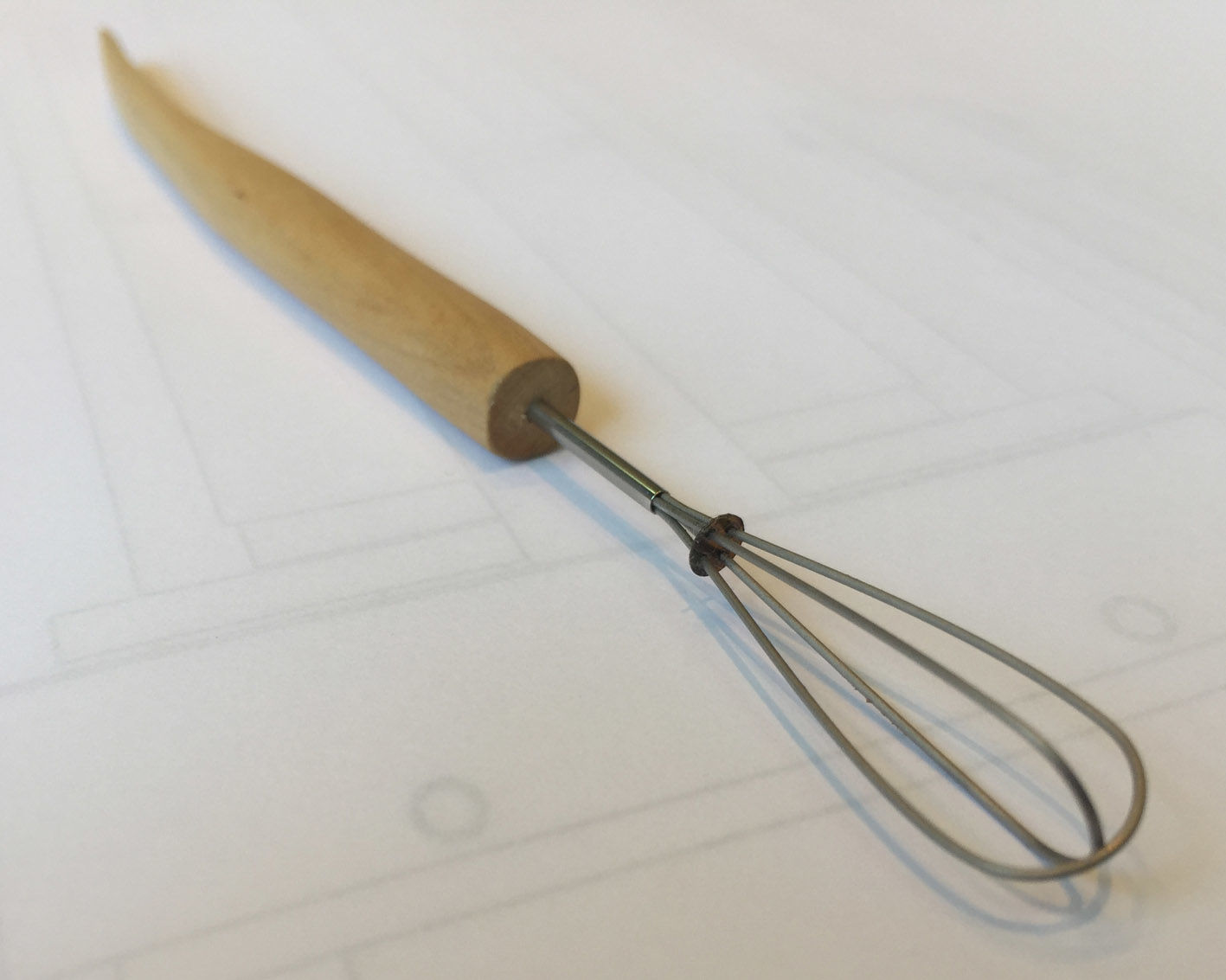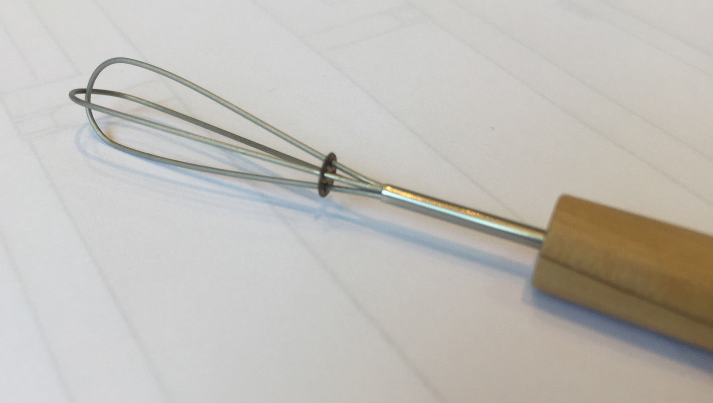 Ha valakinek kell egy direkt kávékutyulásra méretezett miniatűr, precíz, nagyon mutatós "habverő", a kollégámtól, aki tervezte, készítette, vehet ilyet. A keverő rész 0,6mm-es rugóacél huzal, a nyele szobrász mintázófa, a huzalokat összefogó kis köralakú korong lézerkivágással, 0,6mm-es furatokkal készült. Szóval szerintem egy profi darab, én már munkára is fogtam. A méretéről képet kaphatunk, ha összevetjük Kávékalmár rögmentesítőjével. (Méretek szerint a hossza az összefogó korongig 30mm, átmérője 11mm, Kávékalmáré 60mm és 20mm, a huzalvastagság ez utóbbinál 1mm-es.)