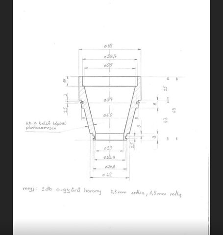 A Mazzer garatszűkítő rajza tőlem származik. Mazzer Mini E-hez készült. Az o-gyűrűk azért kerültek bele, hogy a helyén tartsák és ne zörögjön működés közben, de könnyen eltávolítható legyen takarításnál. Ennél olcsóbb és egyszerűbb megoldás nem jutott eszembe. Ha műanyagból készül akkor lehet kicsit plusszosra venni és elhagyni az o-gyűrűt. Akkor a helyén marad ugyan úgy. Én nem körtefecskendőztem, de ezek szerint ez egy plusz dolog, hogy nem fúj ki mellette. A teteje 58,5-ös tamperhez lett kialakítva. Kéznél van a tamper és nem ugrálnak szét a babok. Az o-gyűrű a horonyba való és nem fölé a nyakára. 1,78-as o-gyűrűk kellenek hozzá. Alulra 33x1,78 vagy 32x1,78 felülre 57x1,78 vagy 56x1,78....amilyet lehet kapni.