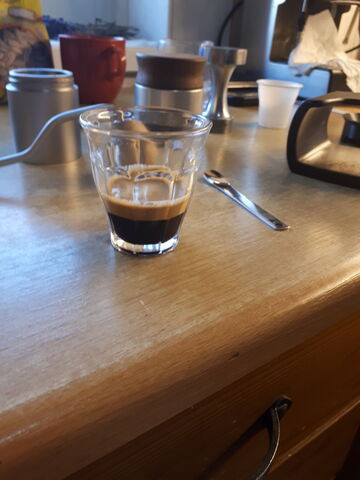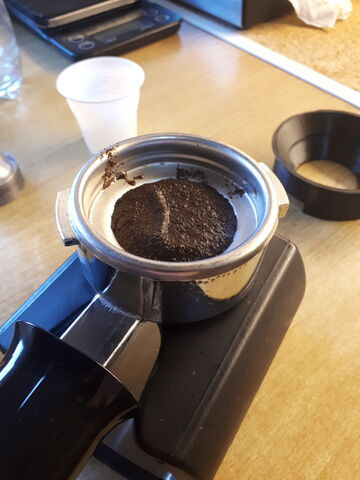Összedobtam most egy hevenyészett szimplát, LM klón, 9g Mocambo Gran Bar, eredmény 18.5g 25mp ( csepptől mérve ) alatt szép egyenletes lefolyással. Meg a pogi kosárban és kiütve