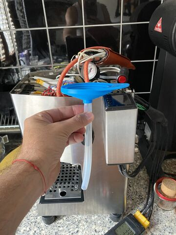 a felső vízbeöntésről sem akartam lemondani, így ez a hőálló harmónika szilikontölcsér van benne amit a kis hézagon keresztül pont be tudok csúsztatni így fixen a gépben van, töltésnél kinyitom utána visszacsomagolom a fedél alá