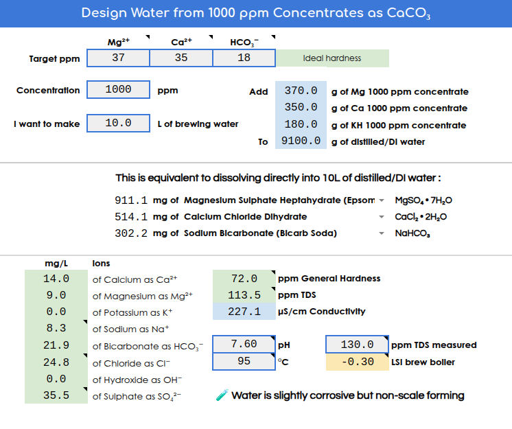 A Bazsee által linkelt kalkulátorral könnyen kiszámolhatod, fönt a target ppm-nél adod meg a víz összetételét, amit ki akarsz keverni, közvetlenül alatta, hogy milyen sűrűségű koncentrátumod van (ha koncentrátumból dolgozol), és hogy összesen mennyi kész vízhez legyen a kevert koncentrátum. Középen a legördülőben kiválasztod, hogy milyen ásványianyagaid vannak, a többit elvégzi a kalkulátor. Illetve csak majdnem, mert csak három összetevővel tud számolni, tehát ha magnézium-klorid-hexahidrátot is és keserűsót is akarsz használni hozzá, akkor egyszer nézd meg, hogy mennyi magnézium-klorid-hexahidrátot számol, azt felezd meg, aztán állítsd át keserűsóra, számoltasd ki azt is, azt is felezd meg, és kész.