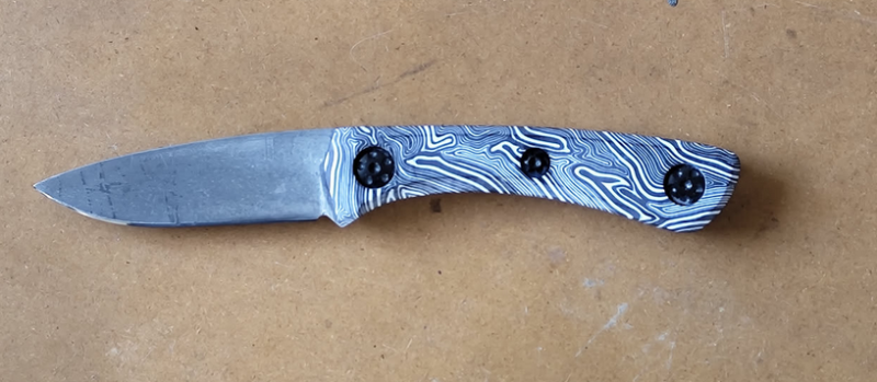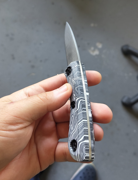 Ezt a kést csináltam egyébként mult héten. Mivel szénacél hiába van szegecselve telibe kell ragasztani ne menjen alá víz mert korrodál. Savmart vaskloridban az némileg segít.