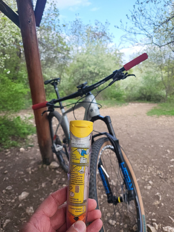 Amúgy egy olyan zöld fényvisszaverő a kormány alatt is szokott lenni a vázháromszögön, itt valamiért pont levettem. Ez egyébként egy ilyen rugalmas, lábszárra tekerhető fényvisszaverős naciszorító.