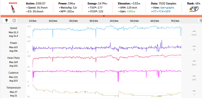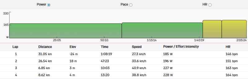 Tegnapi tekerés után (340450 hsz-em) azt hittem ki leszek nyúlva. Kellett pisztolyozni is a combjaim, éreztem őket rendesen. Aztán ma meg mentem egy 2 wattal alacsonyabb kört. Nagyon jól forogtak a lábak, ment volna pár wattal erősebb karika is, de pont jó volt ez így, mivel csak 120g körül vittem CH-t magammal. Tegnap hosszú gatya, kamásli, hosszú álöltöző, hosszú mez, vastag kesztyű...ma meg nyári szett