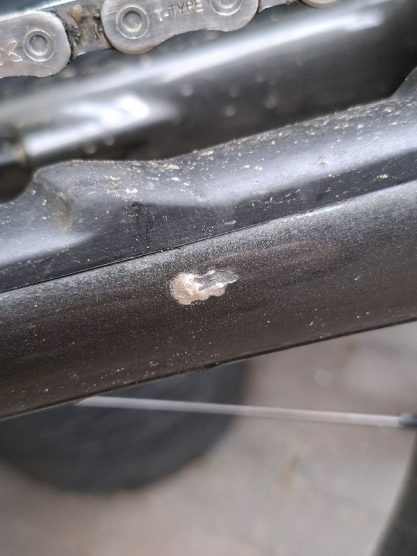 Szakértést kérek. Eladó állítja, hogy csak a fólia sérült. Szerintem ez annál mélyebb. Nem tudom hogyan sérül egy vázvédő fólia, de ez nekem festéknek tűnik. Ott van a gyári láncvilla védő gumi. Ott én nem látom a fóliát. Ezért tekerem be gumibelsővel mindkét láncvillát és nem fóliázok.