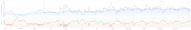 1. szakasz: normál terhelési szintről 15 nap recovery, ezalatt összesen 5 ride, amiből 3 kb bele se számított a terhelésbe, annyira alacsony intenzitás/táv/mittomén