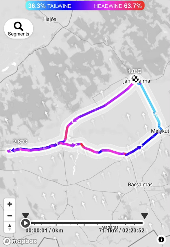 Szél többet számít, ez a mai nagyon kérte a wattokat, az utolsó 10 km-en kívül szinte végig ellenem dolgozott vagy nem segített semmit. Garminra raktam egy tokot, lehet azért mért felül, plusz ugye lakásban tárolom. Az időjárás állomásom szerint 0,9 fokban indultam, 2 fokban érkeztem. Mywindsock szerint 1,8-3,6 között volt. 12-27 km/h közötti szél.