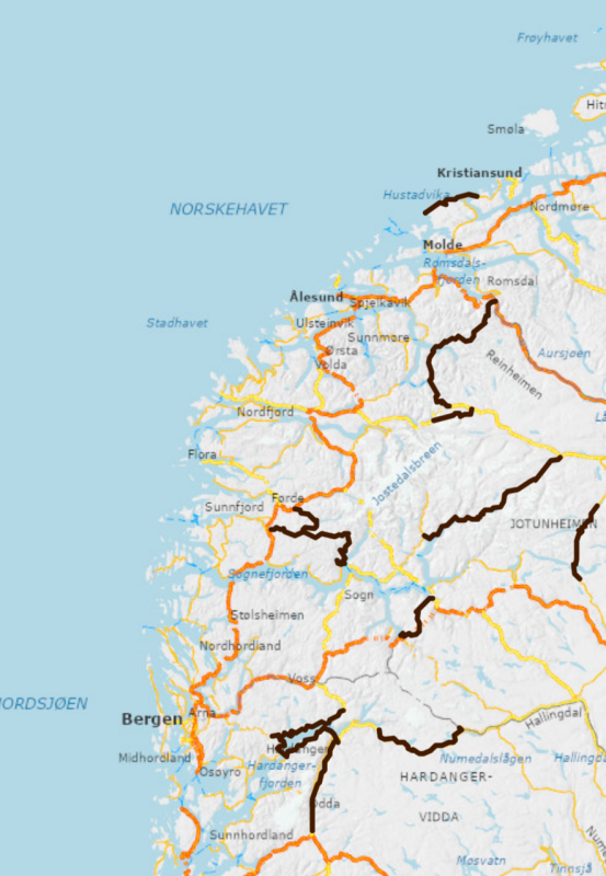 A legfontosabb: Az a négy fekete út ott keletebbre (középen) Hardangervigga, Aurland, Sogne és Valdresflye, szóval a nagyobb hegyeik ott vannak, plusz Hardangervigga a legnagyobb vízeséscsoport a Vøringfossen. Szóval fel lehet menni egyenesen Bergenből Ålesund felé, de reálisabb egy hetes kitérőt tenni keresztül kasul a hegyeken és fjordokon. Mi pl Rondanet már ki is hagytuk (északra Lillehammertől), mert akkora kitérő nem fért bele.