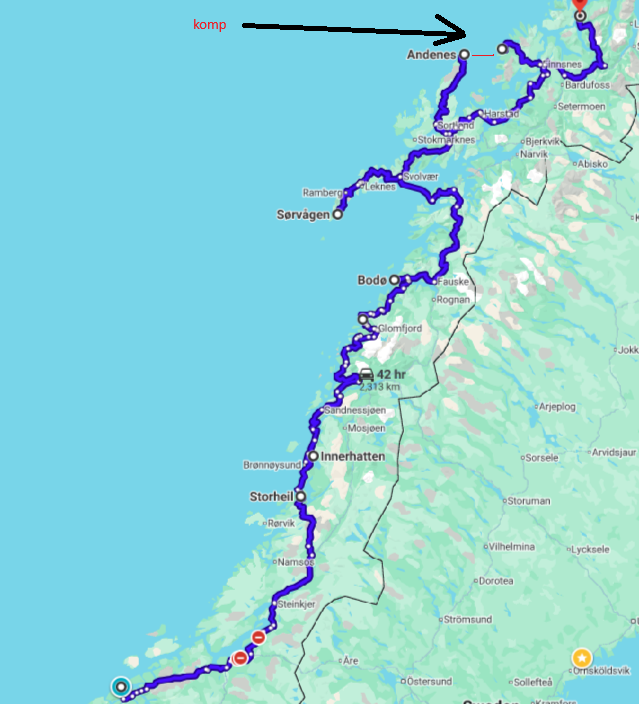 Valami hasonló út reálisabb: [link] ez 2300km és 42 óra, viszont nyáron valószínűleg ott a komp Andenes és Gryllefjord között ami időben biztos rövidít pár órát: