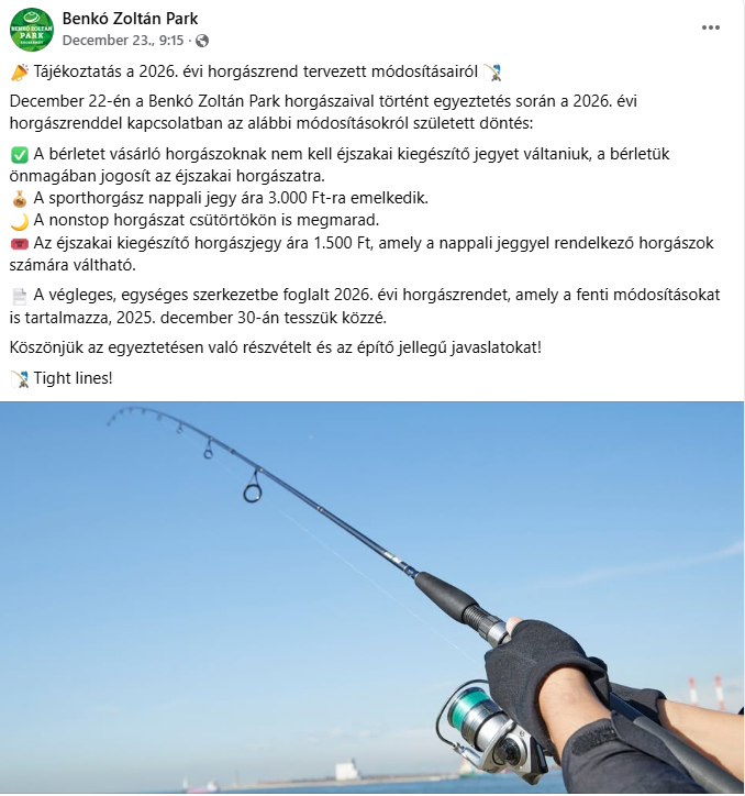 Ha ide jövünk akkor mindenkitől kérem a horgászjegy fényképét mert holnap tudom megvenni.Volt kavarodás a 2026. szabályokkal/ árakkal, de végül egy megbeszélésnél kiderült az aláíró jogosultsággal rendelkező(vezető) személy rossz emberektől fogadót el tanácsokat (átverték rendesen