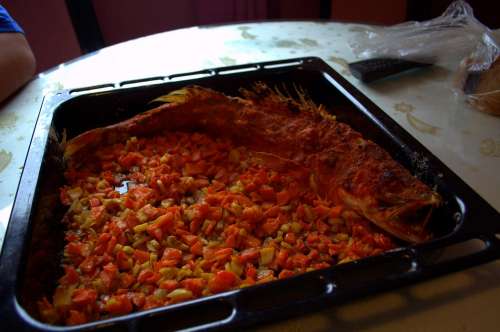 Kizárólag egészben sütjük meg, beirdaljuk, jó ujjnyi közönként és egy vékony szalonnacsíkot tömünk a vágásokba,grill fűszerkeverékkel gazdagon bedörzsöljük ízlés szerint kis sót hozzá, bele a tepsibe a sárgarépa-zöldbab ágyra. A halat pirosra sütjük, ez idő alatt a zöldség megpuhul és valami pazar lakoma lesz belőle és a látvány sem utolsó.
