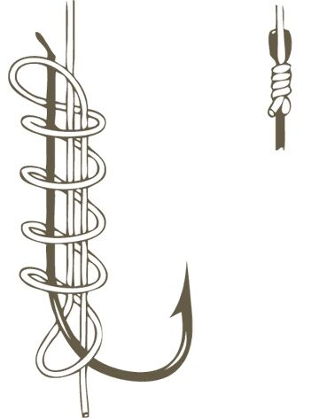 Én a térdeim közé szorítom az előkezsinór dobját, hogy feszes legyen. Készítek egy hurkot a zsinórra, egyik kezemmel a horog öblénél összefogom a hurkot a horoggal, úgy tartva hogy a dob fele álljon a horog füle, tehát feszesen a horog szára mellett fusson az előkezsinór.