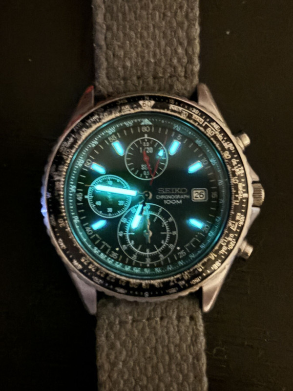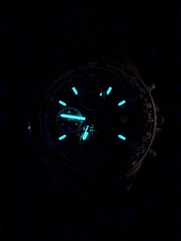 Feltettem rá egy obligát military vibe szíjat, a lume nem rossz, de ezt el is vártam, így néz ki minimális beszűrődő fényben, illetve 3 sec Night Mode beállítással: