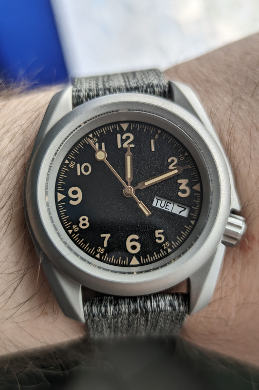 A Baltany kidolgozása meg tényleg mintaszerű. A számlapja fantasztikus, pedig csak sima fekete, de mégis, olyan mélysége van, hogy ilyet még nem nagyon láttam órában.Persze rendelnem kellett az órákhoz egy vagon NATO szíjat kétféle méretbe, 4 színben, bőrszíjakat, textil-bőrszíjakat (ezeket persze a többi órámhoz is), asszem egy darabig nem nyitom meg az oldalt