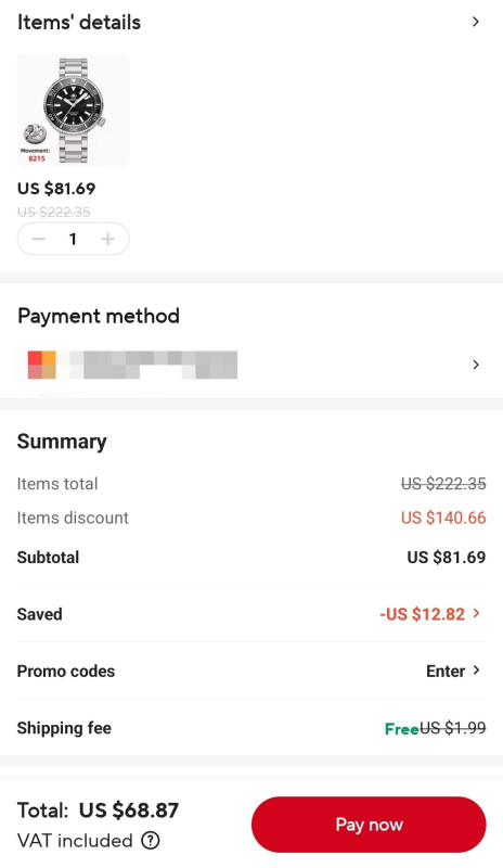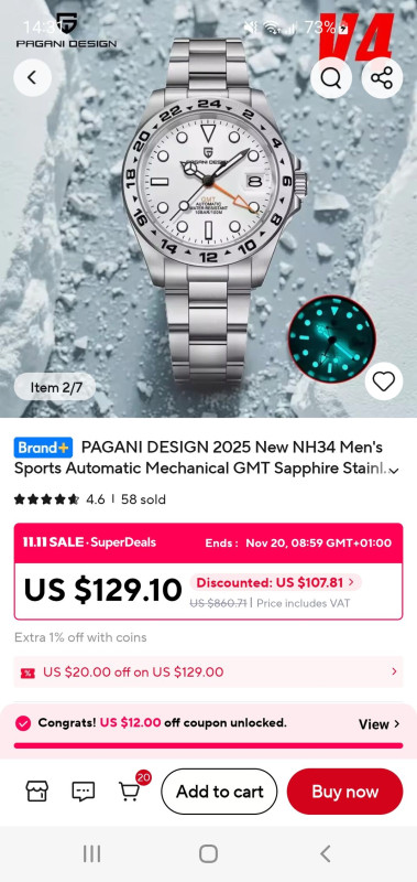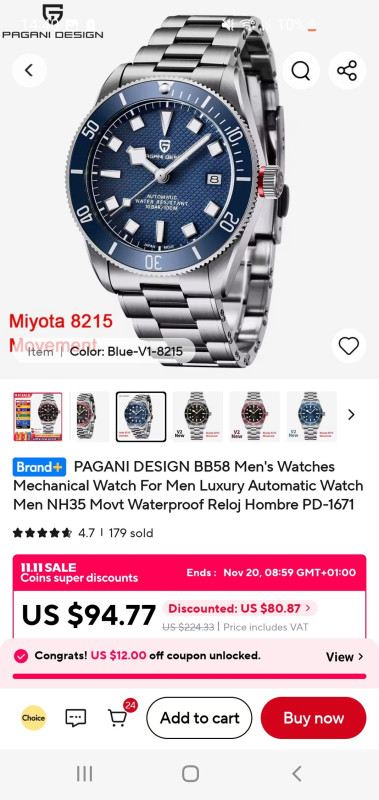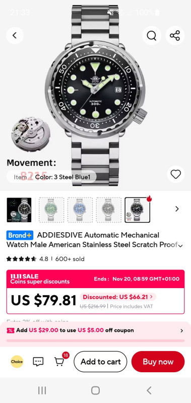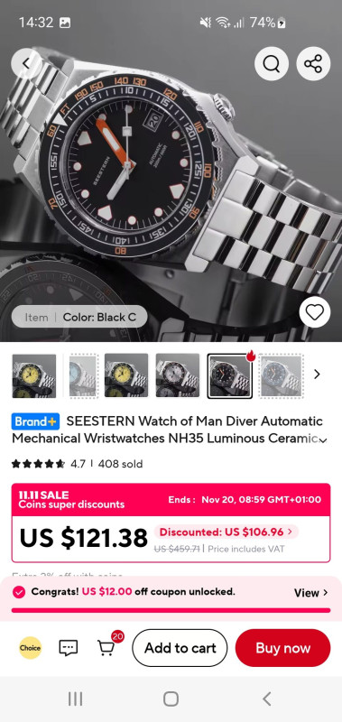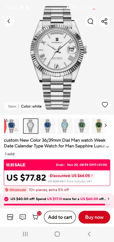 Elértük a gödör alját. A kosaramban lévő $54.91 óra hirtelen $60.51-re váltott. A 11.11 akció közepén. Egy ugyanilyen típusú órát (más színben) korábban $49 körül vettem.