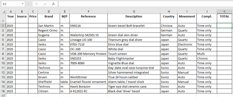 Az igazság néha fáj. Excel, a beszerzési ár és hely oszlopokat töröltem; számok, tények, következtetések.Volume / Value: idén (eddig, és remélhetőleg ne tovább) 15 darab órát vettem; kevesebbet, mint tavaly, akkor 20 volt, de azokból egyet eladtam, hármat elajándékoztam. Tavalyihoz képest picivel többet költöttem, azt fogjuk az inflációra. Összeget nem írok, annyira nem is volt vészes. Ha gyorsan meg kellene szabadulnom tőlük, talán még akkor is átmehetnék pluszba, igyekeztem idén is jó árakon venni.