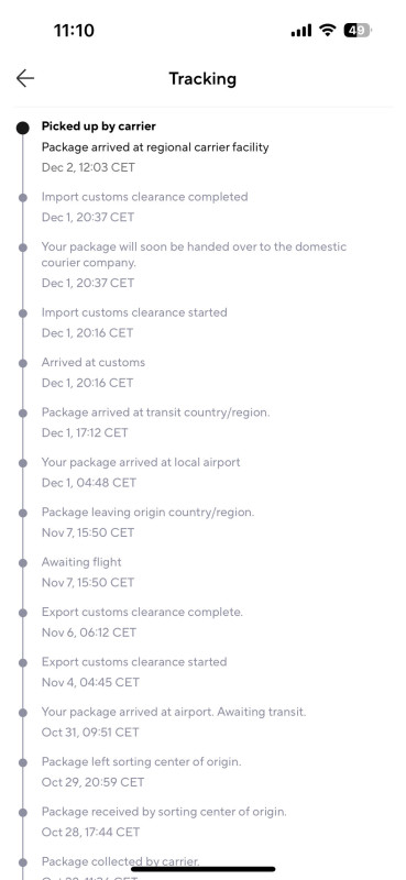 Ali se jobb, október 27-i nagyértékű* rendelésemnek november 7-én sikerült elhagyni Kína légterét és december 1-én landolt Ferihegyen, legalábbis ha jól értelmezem alábbiakat. Rejtély, hogy hol volt a repcsi a két időpont között, lehet, hogy tettek egy gyors kitérőt a Bermuda-háromszög felé és időhurokba keveredtek.