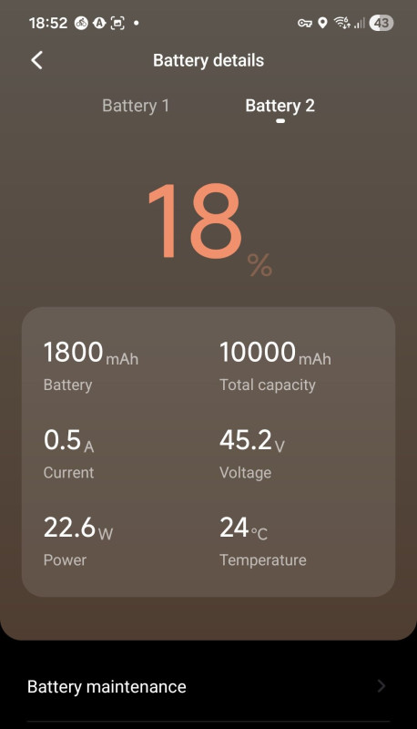 A belső akkumulátor élvez prioritást, volt olyan, hogy 141 W-tal töltötte a belsőt, miközben 20W-tal a külsőt. Tehát egyszerre tölti a kettőt.Fogyasztás: