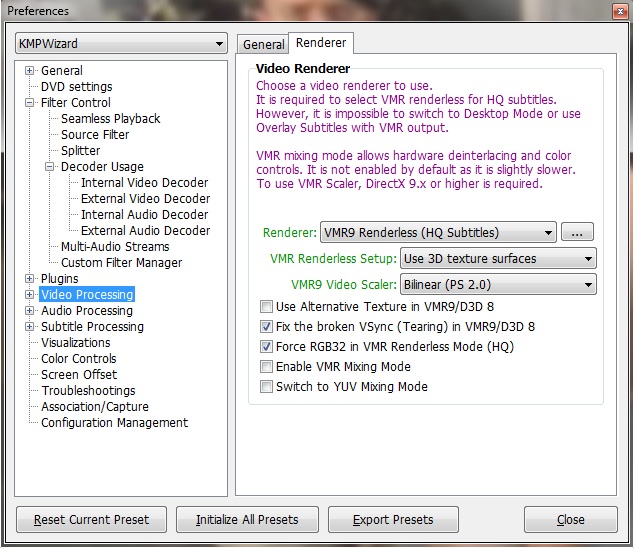 A legfrissebb kmp van fent? Melyik OS-t használod? Vista esetéven az EVR (vagy ha feliratos cuccokat nézel, akkor EVR custom), xp esetén wmr9 render-t kell beállítani. (F2 majd video processing)