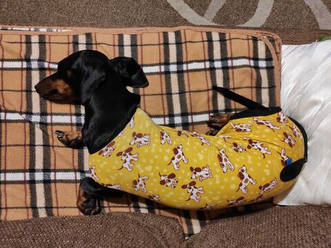 Hétfőn lett ivartalanítva a csajszi, ma már észre sem venni, kutya baja. Kapott csini rucit, meg kell zabálni benne.
