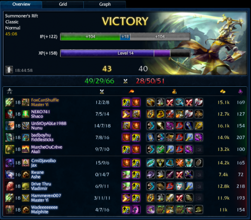 Tegnap rám jutott a supportkodás és csak Nunu és Nidalee champinom van ami alkalmas lehet... Nidalee maradt mert Nunu ment jungelbe. Úgy tűnik sokat javított az új masteri rendszer, mert nem éreztem soha hogy pénz hiányom lenne és csak late game-ben farmoltam, bár csak randuin és shureila teljes itemem volt de végig tudtam rendesen wardot vásárolni és egyszer még oracelre is futotta. Nem tudom, hogy kell support nidalee-t buildelni