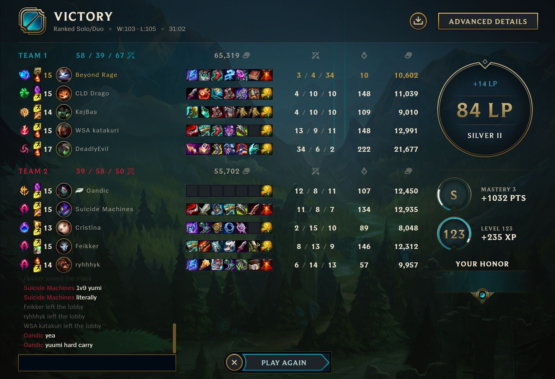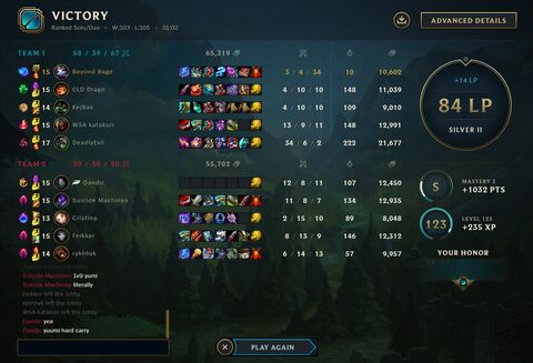 Volt egy olyan hetem ahol zsinórba jöttek a winek úgy is hogy pár meccsen elég gyengén teljesítettem de nem kezdtek el szidni meg noobozni stb..hanem helyette inkább biztattak segítettek ott ahol tudtak. Ez annyira de annyira jól esett hogy azt le írni nem lehet.