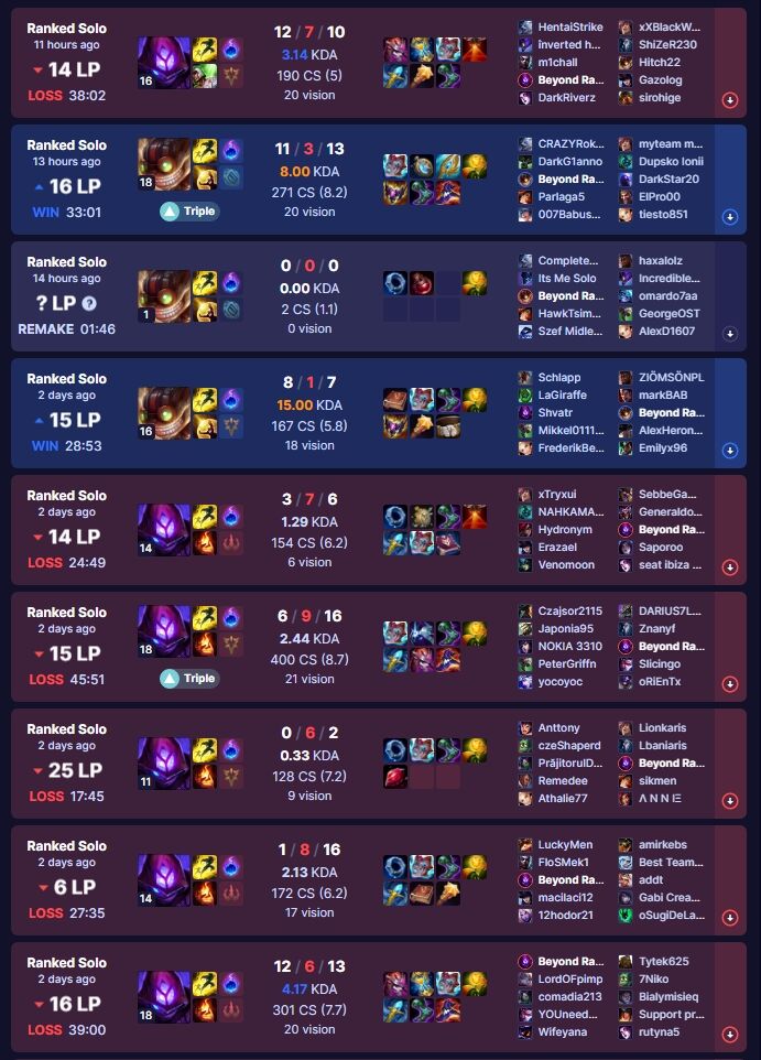 "jobb champeimet" azt írtam szóval ezek az én bevált választásaim nem a meta szerintiek. Jól is megy velük, hát nyilván vannak megnyerhetetlen meccsek, ez csapatjáték 4v5-ben nem érzem azt hogy kötelességem lenne nyerni tudni, de amikor rendes kompetitív közeg van akkor elég jók a meccsek. KDA szinte mindig nekem a legjobb.