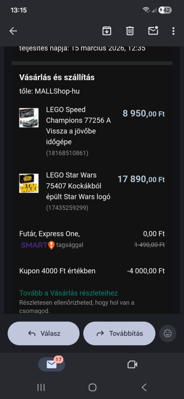 A 17.890.ft ból ha csak azt rendeltem volna még vegyél le 4k-t, de ha csak 2k-t veszel le akkor is kijött 15.890ft-re ami már korrekt. Allegro volt.