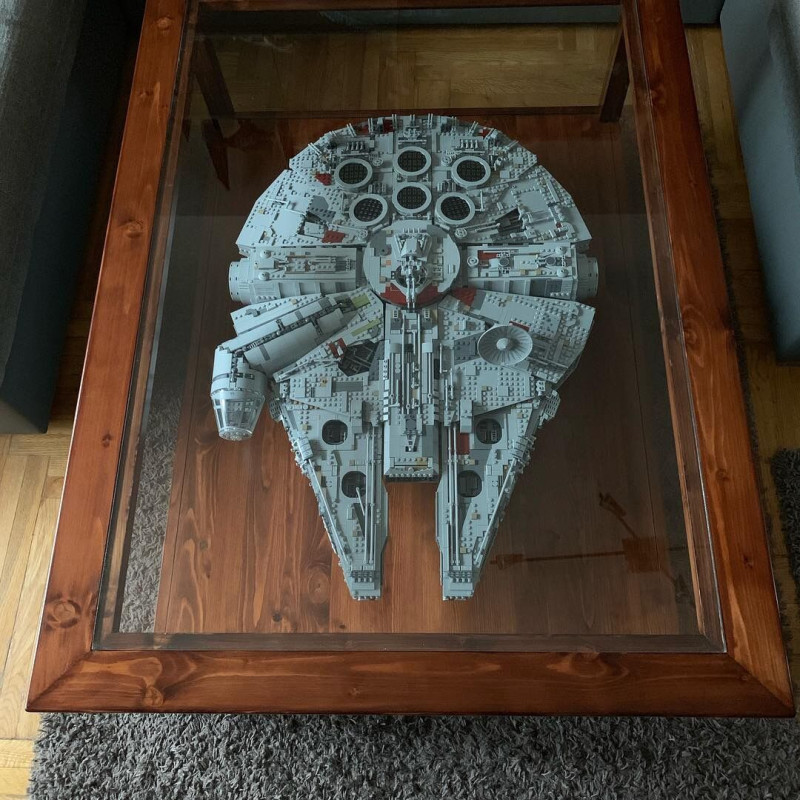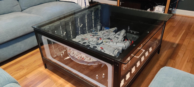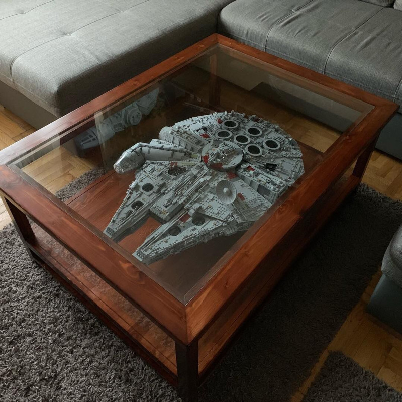 Én inkább egy tök fekete asztalt csináltatnék, aminek három oldala tömör fa lenne, csak az egyik rövidebb oldalán lenne egy üvegablak, lekerekített, fehér LED csíkkal megvilágított kerettel, hogy a dohányzóasztal úgy nézzen ki, mintha a 327-es dokk lenne a Halálcsillag I-en, amibe felülről bele tud nézni az ember.