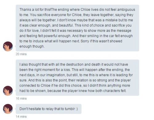 Nagyon helyes szerintem Chloe halála és temetése az igazi Good ending, Arcadia Bay feláldozása egy összecsapott semmit mondó elég pocsék befejezés lett, pláne úgy hogy Max-nek élete végéig azzal a tudattal kell élni hogy az összes barátja és több mint ezer ember halt meg miatta, egyetlen ember miatt, és nem ám túlélők utána keresnének hogy egyáltalán túlélte-e valaki ? Á nem inkább vígan mosolyogva elautókáznak Arcadia Bay-böl. Chloe is elég hamar túltette magát azon hogy a szülei halottak.Chloe temetése eléggé megható és szívfacsaró de legalább Max megtanulta a leckét hogy sose lehet szarakodni az idővel. -