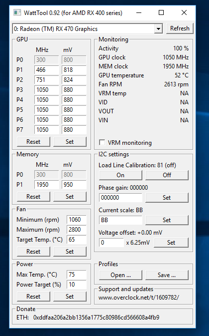 ZEC esetében én minimálisan visszavettem a GPU-t (1200Mhz-re), a feszt 1000-1050mV körülre (attól függ, melyik kártyának mennyi volt a gyári értéke, van, amelyik 1150 körül, van, amelyik 980 körüli mV beállítással működik gyárilag, nem is értem, h 2 egyforma kártya miért tud ennyire különböző lenni