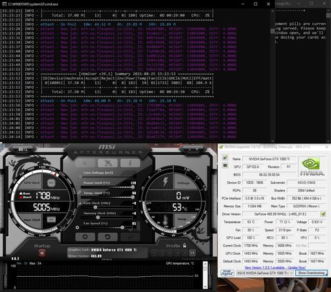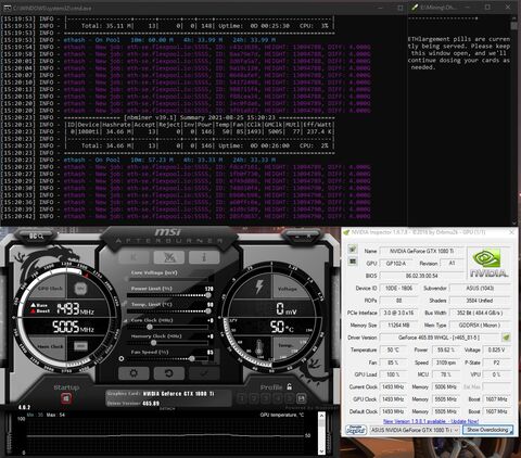 Próbáltam az ohhgodanethlargementpill-t is a t-rex mellett, az kb semmit nem változtatott, talán kicsit hűvösebb lett a kártya.NBMinerrel installáltam a drivert mert kérte az első indításkor. Aztán még a parancsokhoz hozzácsaptam a -mt2 kapcsolót, a memory tweaket. Az talán hozott +3 hashratet, mert alapon ott így 35-36 körüli a hashrate.