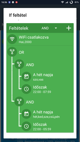 Tehát ha hazaérkezem és csatlakozik a wifi, akkor aktíválódik az Otthoni mód, ha elmegyek, akkor az Utcai, de közben 3 perce aktíválódik a Bt mód is, ha netán csatlakoznék a Bt fülesemmel. Ha pedig eljön a 21 óra, akkor az időpont esemény hatására aktiválódik az Éjszakai mód, kivéve, ha csatlakozva van a Bt, mert akkor nincs szükség rá.