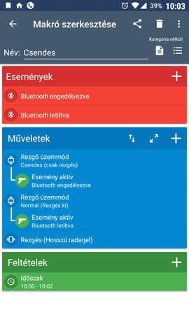 A linkelt képen csináltam egy próba makrót. Ha nincs feltétel, akkor a Bluetooth bekapcsolásra rezgőbe kerül a telefon. Ha megadom a feltételt, bekapcsolt Bluetooth mellett nem megy rezgőbe, hiába teljesül a feltétel. Miért?