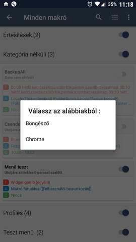 Beállítások / Telepített alkalmazások / MacroDroid / Engedélyek / 26 jogosultság