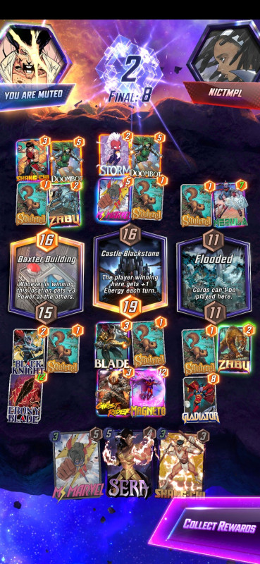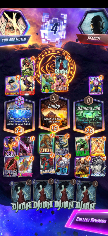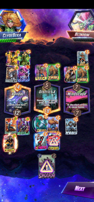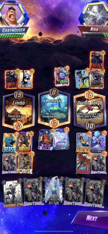 Na végre nekem is volt egy (nem is olyan) kis szerencsém, District X - utolsó körben rakom le mid-re MsMarvel-t + Cyclops, mert tudtam, hogy van nála Juggernaut (nem értem miért nem rakta jobbra). Csak közben bevallom őszintén nem vettem észre, hogy nebula és Ghost spider (nincs meg ez a kártya) is 1 cost