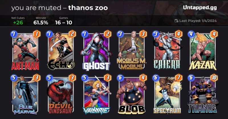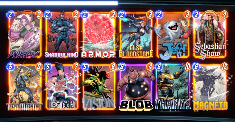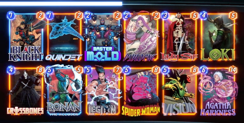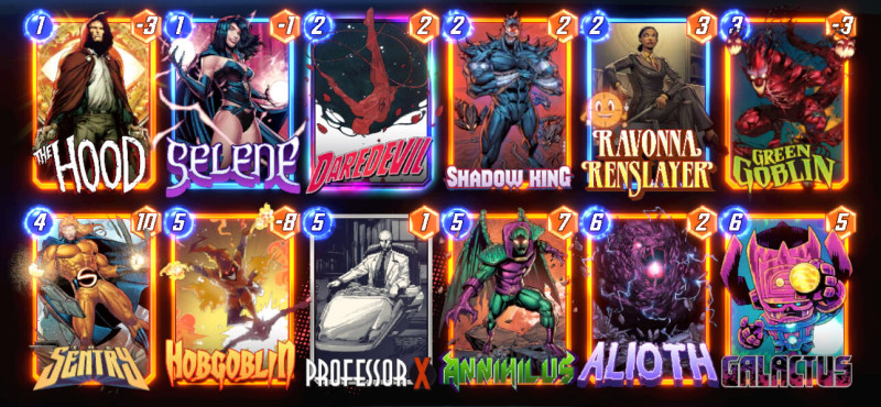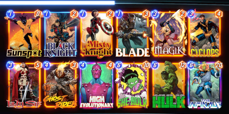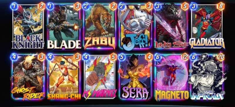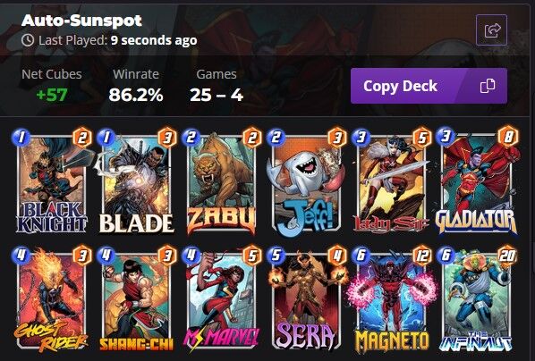 Aki követi a Marvel Snap tartalomgyártókat már értesült róla, hogy a lenti listával a deck kiagyalója global top 1 helyezést ért el. Azóta már több streamer/youtuber is csinált róla videót. Conquesten is jól teljesít, több ember is posztolt róla hogy végigvitte infinite conquest-en.
