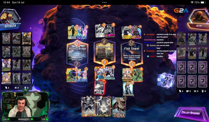 Dekkster Gwenpool pakliját nyúzom, elég jót megyek vele, viszont most leszivatott. Pont Spyro ellen, utólag ki is kerestem a stream-et, de ő sem értette, a chat segített. Captain Marvel-nek be kellett volna mozdulnia középre, viszont Marvel-t előbb kiraktam mint ő Mysterio-t és a végén előbb Captain mozdult volna, de nyerésre álltam így maradt a helyén, aztán csak utána fedte fel magát Mysterio..