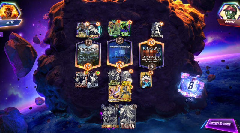 Igen-igen, tervezni kell előre. Sajna nincs kiforrott taktikám és biztos lehetne jobban is játsztani a deck-et, de pl. ha nálam van Kraven az elején, akkor általában bal vagy jobb lane-re rakom és egyedül hagyom legalább T4-ig. Ha később jön, akkor T6-ban szerintem Kraven mehet egy lane-re Captain Marvel másikra és így elég nyerő kombó Ms Marvel-al. Storm/ProfX-el az ellentétes lane-t próbálom zárni mint ahol Kraven van. T4-ben mozgatok egy lapot, hogy T5-ben Miles ki tudjon menni egy 4 cost lappal (Gwenpool a legjobb). Rengeteg snap jön opponent-től, mert azt hiszik nem tudok pontot tenni egy lezárt helyre már..