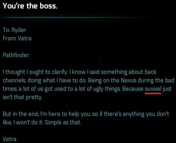 Amikor Hacket, Illusive man, Anderson, akárki küld egy emailt a terminalra, hogy menj ide/amoda, pucold ki ezt a bázist és ennyi volt, na ezek voltak a rosszabbak, pedig azért a korábbi játékokban elég kevés mellékküldi volt. Itt mégis jobban hat, hogy beszélsz az emberekkel még ha csak arra a pár percre is, de látszik, hogy van mögötte valami nem csak egy skirmish. -