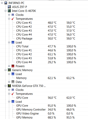 Ilyen 50% körüli a terhelés a Nexus-on állva, futva talán egy 5-10%-al több. Ahogy nézem azért a küldetéseken elmegy 100%-ig a CPU meg a GPU is. A hűtés lazán bírja mindkettőnél, simán lehetne húzni őket, de most nincs keret új konfigra, úgyhogy nem kockáztatom meg.