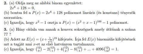 2. konkretabban nem tudnal segiteni, hogy mely fogalmakat nem erted? igy nehez, hogy nem tudom mi az alap, sot az se derult ki hogy ezekkel a feladatokkal mi a cel - ha zh-t irsz akkor baromira nem lesz eleg ha pont ezt tudod, kell a komplex gyok, kell a binomialis egyutthatos osszeghatvany...