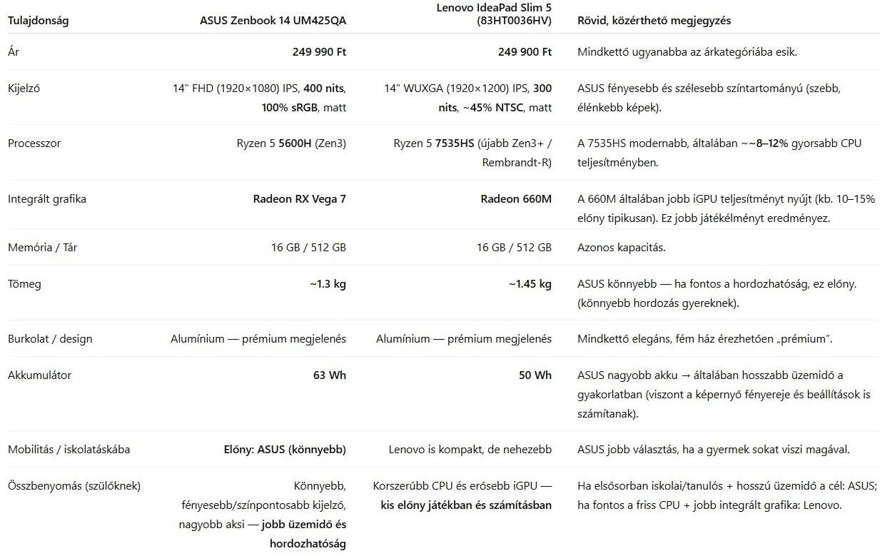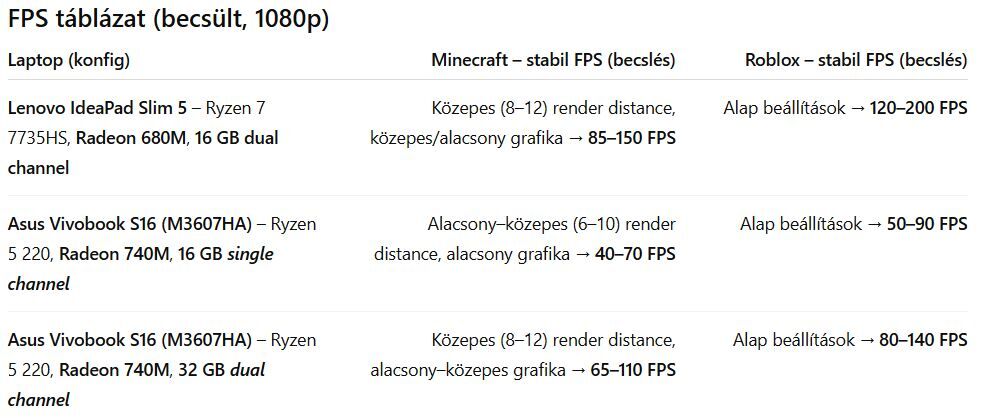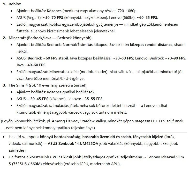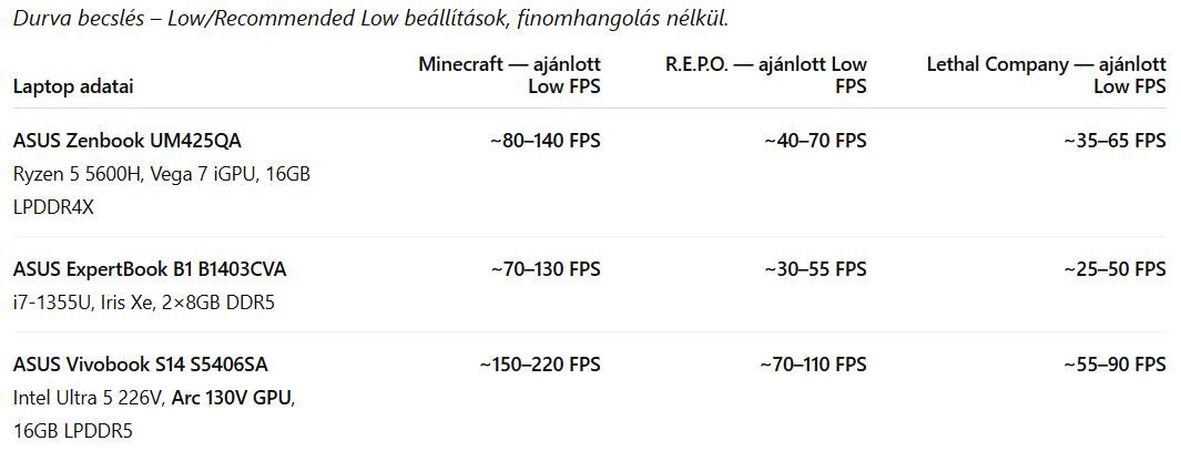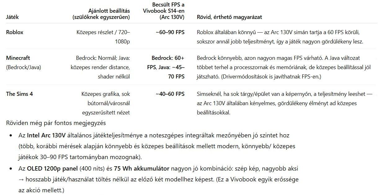 Ezt a két laptopot találtam kisebb játékokra is alkalmasan erős integrált grafikával. Az AI-t kértem meg egy [táblázatos] összehasonlításra és a [játékteljesítmények] értékelésére. Végül benézetem még az ASUS gyári webshopba, és az ott talált Vivobook lesöpri mind a két előző modelt. A Vivobook [értékelése]. Ha még kapható, akkor ezt kell megvenni: