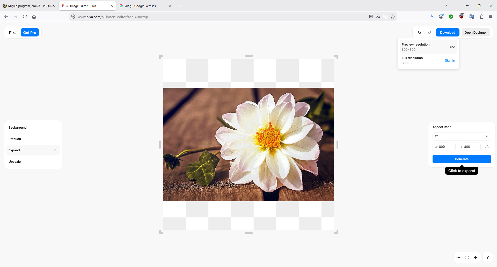 4. "Elmegyünk" a https://www.pixa.com/uncrop oldalra és beállítjuk a képen látható beállításokat (ez esetben 800x800) és letöltjük a preview-tElötte | Utána (800x800 no Uncrop, AI)
