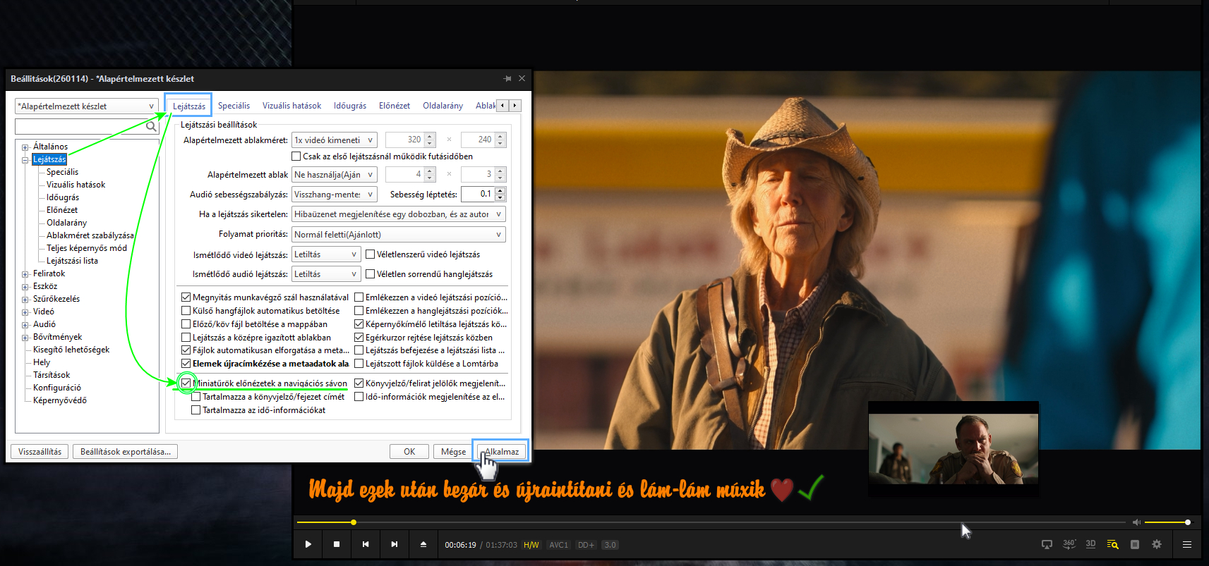 Video Renderer résznél próbáld ki ezeket sorrendben (mindegyik után nyomj Alkalmaz → OK, majd tesztelj egy videót dupla kattintással):