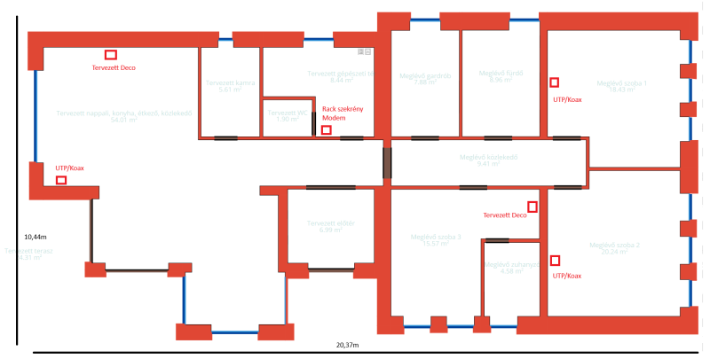 Négy téglafal plusz egy beton födém esetén kábellel visszük el a netet a következő WLAN access pointhoz vagy mesh eszközhöz. Egy betonfödém esetén az egymás alá-fölé helyezett mesh átjátszók még működhetnek, de amikor már újabb falak jönnek a képbe, ott már elmegy fosba a jel minősége is.