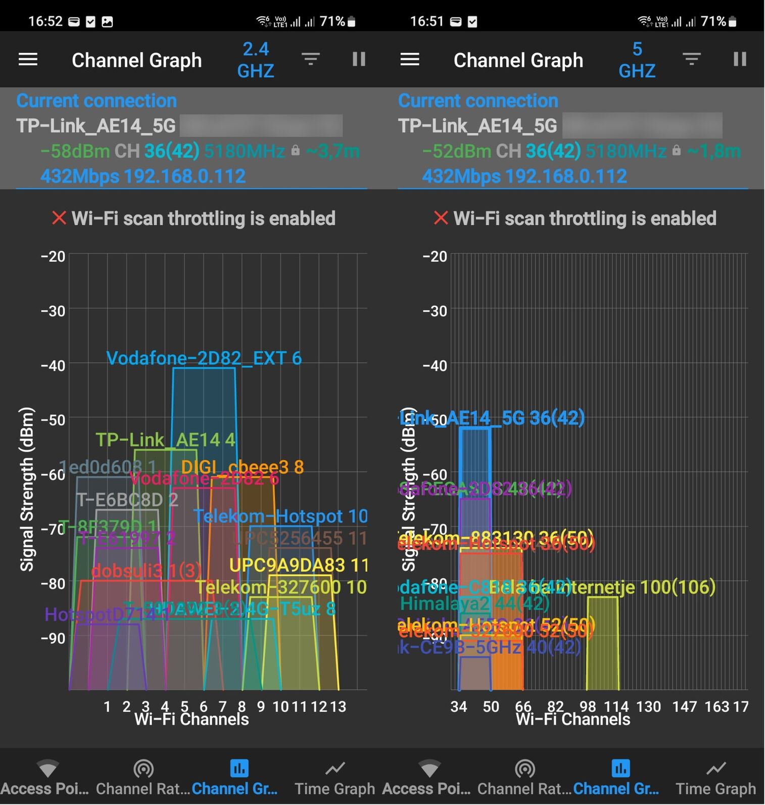 55m2-es lakás, de nagyon gyenge a jel. A másik szobában a betonfal mögött az 5 Ghz-es frekvencián már szinte nincs is jel, de a 2,4 Ghz-nél is a szomszédok wi-fijei erősebbek.