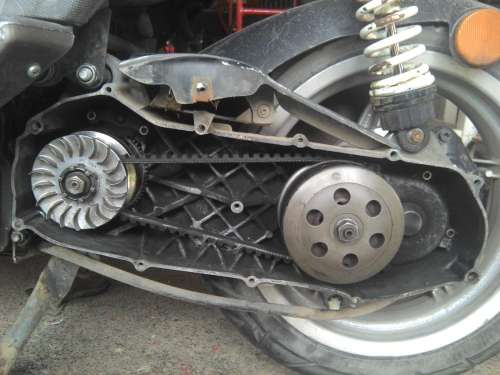 Ha láttatok már ilyet...Ezt menet közben. És úgy ment így is, mint a rakéta...az is megvan miért evett meg eddig négy szíjat...ferde a főtengely. Csak mindig azt mondtam, hogy az önindító nem jó, mert alig tekeri a gépet. Na ezért. Eddig mindig felcsavarozott dekninél próbáltuk, most ráraktam töltőre, és úgy, önindítóval. Látszik, hogy kalimpál a variátor...