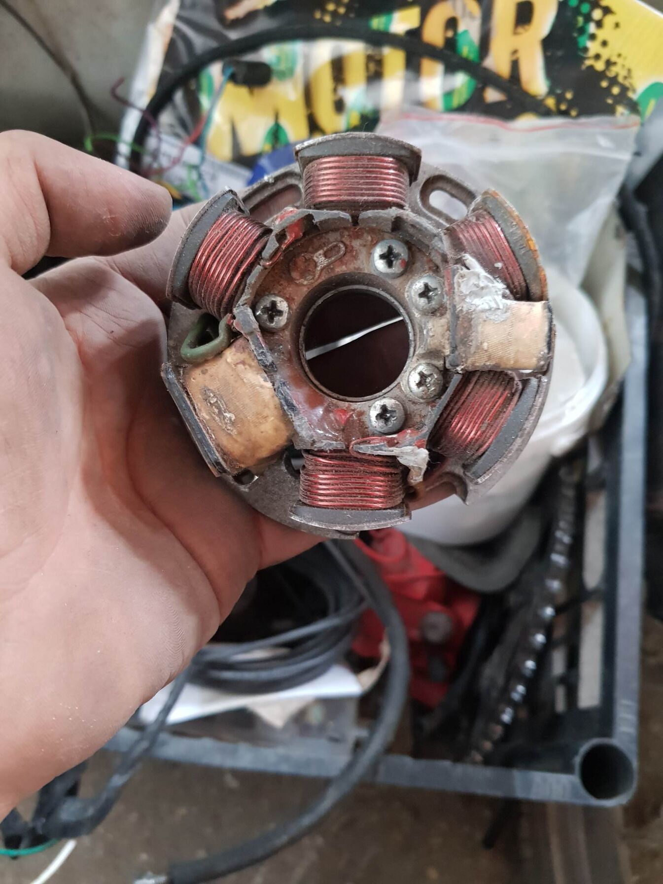 A régit le kéne fotózni. Túl sok dzsuva nem lehetne rajta, mert akkor nem indul be, illetve kopott a motor. Egy minimális fekete lerakódás oké, de amúgy a gyertyaelektródának barnának kéne lennie. Ha benzines az "ok", akkor a fent leírtak egyike lehet, ha olajos, az viszont probléma.