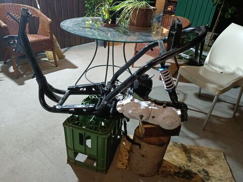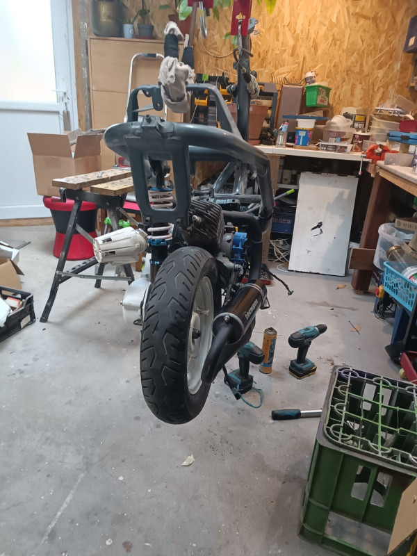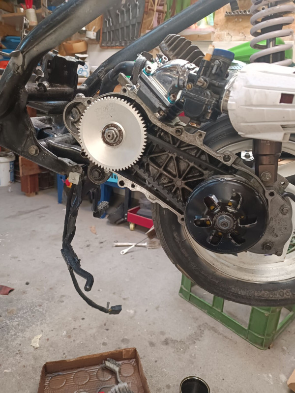 Naraku 75ös vashenger ami már 80as (gyűrű törés tavaly), hozzá a nagyobb hengerfej kicsit megemelve. Nagy leömlő, 19es dellorto phbg (kínai, de be lett fúvókázva szépen), egy ilyen főtengely. Hajtásba alu nyomótárcsa, "sport" variátor (ezt idén cserélem egy normális multivarra), sport kuplung, kuplungharang (el kellett emelni a hátsó deklit egy 5mm vastag bakelit "alátéttel, h beférjen